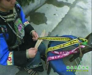 苗家花帶,織花帶,是苗家姑娘最盛行最喜愛的一種習(xí)俗。在苗家,從女兒長到七八歲起,母親就要叫他做針線活,待到十歲左右就交他學(xué)織花帶,如果母親技藝不高,還要請寨子里花帶技術(shù)最高的婦女來教。又得女孩子,從母親或姐姐那里初步學(xué)到織花帶技術(shù)后,就在本寨子邀同齡伙伴,三五個在一起,互相切磋技藝。待到編制技術(shù)日趨成熟后,姑娘也大了,就往往一個人躲在房中編制出色鮮艷的花帶,風(fēng)險少女的情愛。苗家姑娘,往往拿自己編制的花帶作為禮品相贈,特別是姑娘有了意中人,就吧花帶作為愛情的信物相贈,以表示以身相許,愛情純貞。