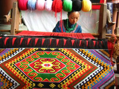 土家織錦是土家婦女用一種古老的木腰機,以棉紗為經(jīng),對五彩絲線或棉線(當(dāng)今也有用毛線的) 為緯,完全用手工織成的手工藝術(shù)品。
