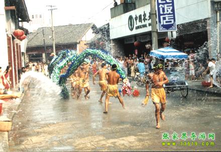 張家界潑水龍又叫“澆水龍”,于唐朝時期由移居本地的白族興起演變而成,在永定區(qū)的尹家溪鎮(zhèn)西尹村、莫家崗村十分盛行,是當?shù)?a class="insidelink" href="http://m.clairebellhome.com/fengqing/1130174734.html" target="_blank" title="土家族">土家族,白族、苗族在天熱干旱時節(jié)求雨祈福的一種形式。一旦出現(xiàn)旱災,當?shù)仡^面人物就會出來組織潑水龍,演出極其隆重。