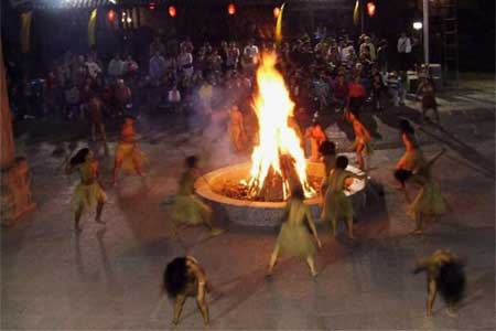 “擺手”,土家人稱為“社巴”,正月初三至十七日這段時間稱為“社巴日”或“社巴節(jié)”,歷史上,土家人在各村寨都建有“擺手堂”和神廟。在神廟內(nèi),還供有土家族的祖先八部大王或土司王神像.每到“社巴節(jié)日”都有歌舞活動。這種調(diào)年擺手舞叫“社巴”也有叫“調(diào)年”的,有強烈的戲劇性,有故事情節(jié),還有人物,它由拔普(公公)、拔帕(婆婆)、阿達與阿柯等男女老少集體在而舞。 擺手舞的形式一般是這樣的:在擺手堂的中央高掛龍旗,四方點燈,由金童玉女給土家人用銅盆洗手,再從香火山取來神火,然后在龍旗下點燃3堆篝火。隨著3聲炮響,先由梯碼法師(巫師)手舉八寶銅鈴作前導,大家跟著翩翩起舞,徹夜不眠。 擺手舞的主要動作在走路與彎腰時,擺動同邊手。擺的形式,一般分單擺、雙擺、環(huán)擺、花擺、插擺與擺七步等,因為擺得多,所以稱“擺手舞”。擺手舞,還分“小擺手”與“大擺手”。“小擺手”的規(guī)模的較小,形式與內(nèi)容主要是模擬挖地、播種、薅包谷草、摘包谷或者是在田里插秧、扮谷、曬谷等多項農(nóng)事活動,也有表現(xiàn)打獵或漁獵活動的。有些地方的“小擺手”舞也有表現(xiàn)吹木葉、接新娘等生活內(nèi)容的。 “大擺手”,主要是規(guī)模大,參加的單位往往是幾個甚至幾十個村寨,參加的人數(shù)也幾千人或上萬甚于幾十萬人的。“大擺手”的內(nèi)容比“小擺手”豐富,除表現(xiàn)農(nóng)事活動和土家人生活以外,還有表現(xiàn)軍事活動的。“大擺手”的形式,一般先由領頭人手執(zhí)五彩布條做的“柳巾”指揮,接著是“梯碼”隊(由巫師組成)和鼓樂隊,同時,男女擺手舞隊也一起入場。這其中還有特別引人注目的披甲小旗隊(他們身披打花鋪蓋象征盔甲)。這支披甲小旗隊手執(zhí)小花旗,顏色有紅有綠,有黃有藍,色彩艷麗,五彩繽紛。他們表演的內(nèi)容與形式,主要是反映人類起源,先民軍事活動、部落搬遷等,舞蹈動作難度較大,為廣大土家人所喜愛。