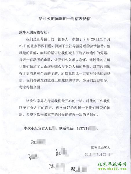 - 游客夏先生為表揚導(dǎo)游李姣姣寫來表揚信致我張家界... [14811]