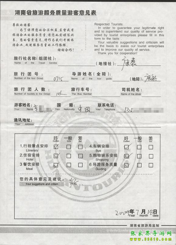 2009年7月15日辛先生一行10人質(zhì)量接待反饋單: