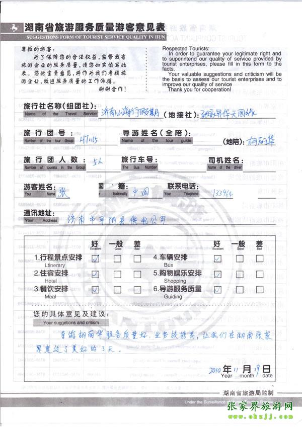 2010年11月15日張小姐一行5人評價(jià)導(dǎo)游優(yōu)