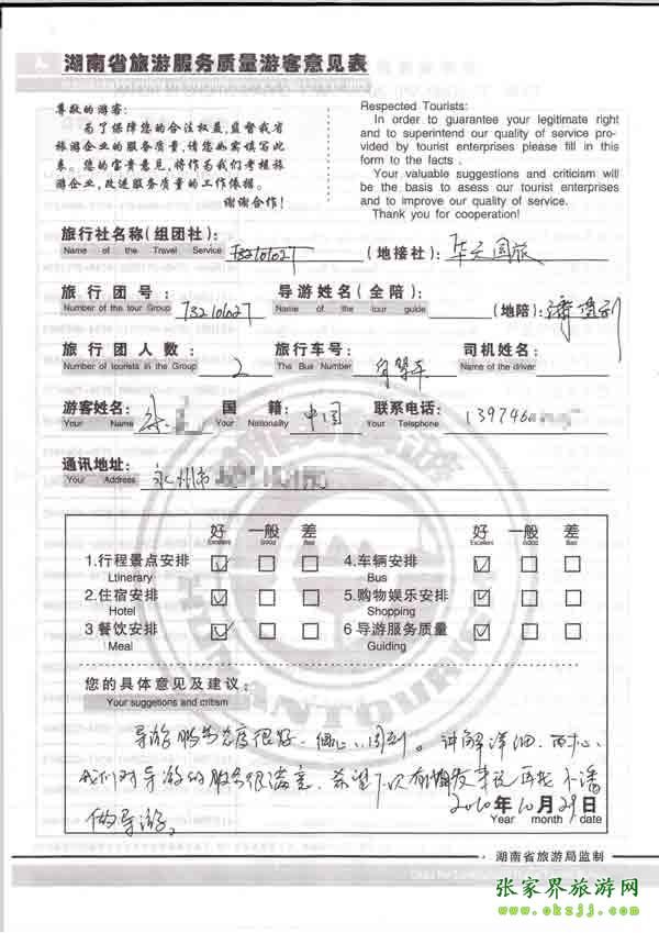 2010年10月29號(hào)永州朱先生一行兩位旅游質(zhì)量反饋:對(duì)導(dǎo)游很滿意,下次來(lái)還找她