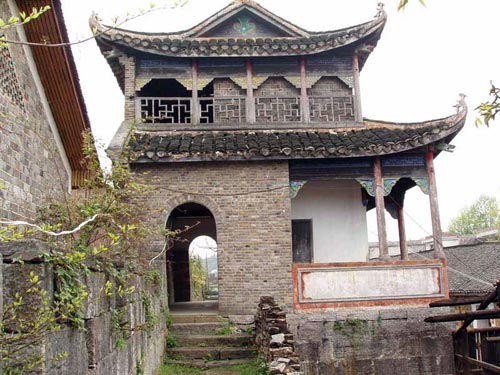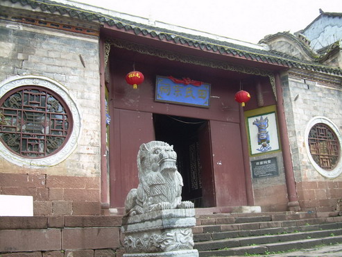 這是一處具有濃厚民族特色的建筑群,有大門、正殿、戲臺20多間屋宇,并有天井、天池、回廊,還設(shè)有“五福”、“六順”兩門。