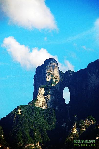 天門洞簡介 天門洞是天門山最具有代表意義的景點,它位于天門山山體的中上部,海拔1300米,門高131.5米,寬57米,深60米,是世界上最高海拔的天然穿山溶洞。 天門洞南北對開于千尋素壁之上,扶搖而通天,氣象變化萬千,似明鏡似天門鑲嵌于蔚蔚天幕之上,終年吞白云吐紫霧,渲染著神秘莫測的氣氛而更顯出塵脫俗,正所謂奪盡天地之造化,藏盡天地之玄機,而成為千古難解之謎,尋尋覓覓,終是難解。置身其間,宛如入身天宮帝閣一般,大有“我欲乘云仙飛去,直入九霄攬乾坤”之感。“天門洞開云氣通,江東峨眉皆下風”元朝的著名詩人張兌曾這樣贊嘆,磅礴的氣勢由此可見。