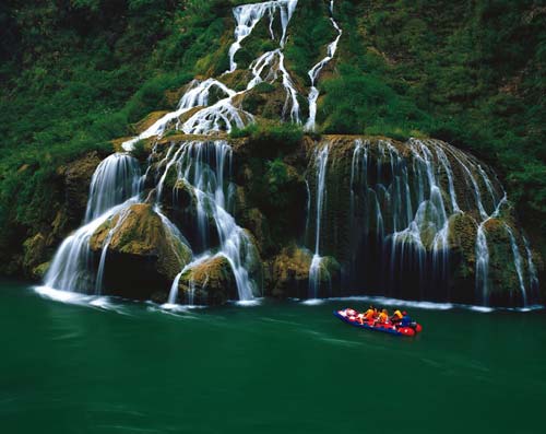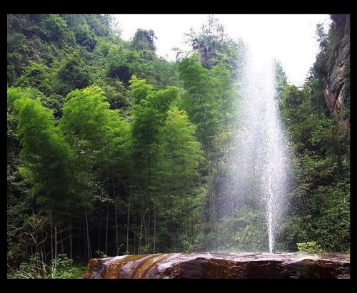 在金鞭溪游覽過程中,可見一組奇峰,有兩座較高的石峰緊密相連,下半截連為一體,上半截一高一矮,高者略欠身,低者稍后仰,好一幅相愛擁抱的絕妙畫面,恰似一對(duì)久別重逢的夫妻,故名相會(huì)峰,亦稱千里相會(huì)。相傳東海龍宮小龍女常來此地觀賞風(fēng)景,一次偶然的機(jī)會(huì),結(jié)識(shí)了峨眉山遠(yuǎn)道而來的后生,二人情投意合,很快便產(chǎn)生了愛情。龍王知道此事以后,非常惱怒,決意拆散二人,多次將小龍女關(guān)在龍宮,但小龍女想方設(shè)法逃出來,常常與情人相會(huì)。龍王一氣之下,將二人點(diǎn)化成石,便成石峰“千里相會(huì)”。 十一、茅巖河漂流